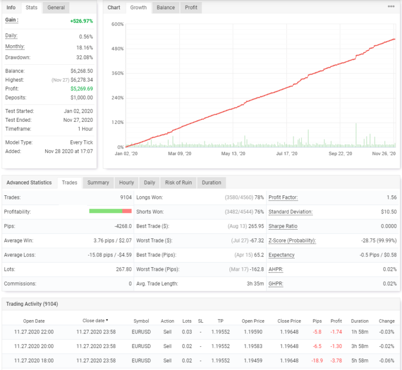The trading statistics will automatically give you information such as your trade performance, how well your strategy is working. Additionally, you can also gain access to other information such as profitability, profit factor and so on.